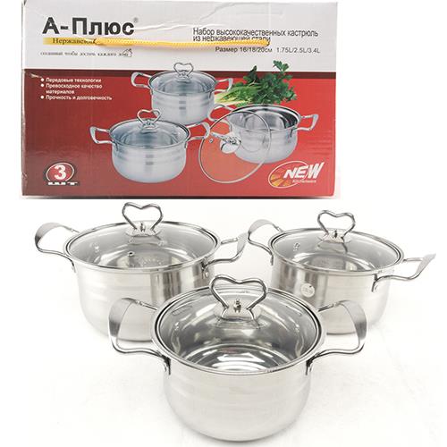 Набір каструль нерж. 3шт. 1.8/2.5/3.5л. скляна кришка 2063 А-Плюс (12)